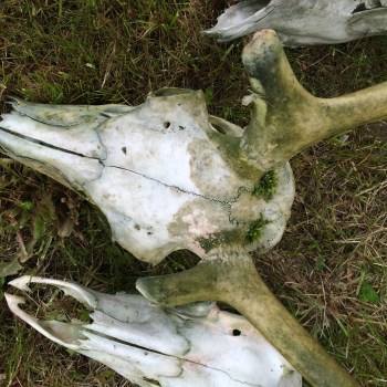 One of many mossy caribou skulls arranged in lines out front.